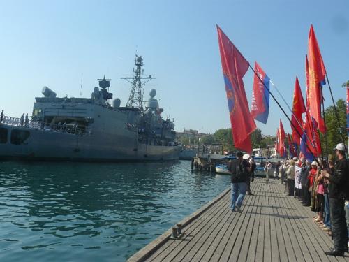 Поэтому, с раннего утра активисты и депутаты Блока Наталии Витренко "Народная оппозиция" заняли "дальние подступы" входного мола в Севастопольскую бухту, условно преграждая путь незваному гостю.
