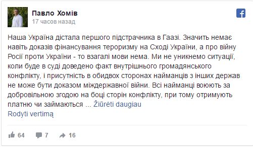 «Наша Украина получила первый подс...ачник в Гааге. Значит нет даже доказательств финансирования терроризма на Востоке Украины, а о войне России против Украины вообще речь не идет. Мы не избежим ситуации, когда будет в суде доказан факт внутреннего гражданского конфликта, и присутствие в обеих сторонах наемников из других государств не может служить доказательством межгосударственной войны. Все наемники воюют по добровольному согласию на стороне сторон конфликта, притом получают плату, занимаются мародерством во время этого конфликта. При этом с обеих сторон - это уже очевидно. Поэтому наказывать нужно обе стороны за мародерство, насилие, убийство мирного населения. Поэтому виват правда...», - пишет Хомив на своей странице в Facebook.