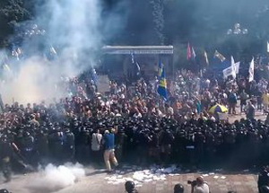 Обвинив Петра Порошенко в «предательстве национальных интересов в пользу Кремля» ультраправые националисты попытались прорвать милицейский кордон, бросив в оцепление боевую гранату, от взрыва которой погибли трое служащих Национальной гвардии - Игорь Дебрин, Дмитрий Сластиков и Александр Костина, в то время как всего в результате массовых беспорядков под Верховной Радой пострадали более 140 правоохранителей и гражданских, что позволяет говорить об экспорте «мукачевского сценария» в Киев, подтверждающего неспособность Администрации президента взять под контроль фашиствующих молодчиков.