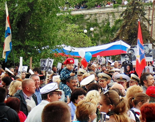 С разных концов города к центру стекались колонны людей, постепенно сливаясь в один большой поток. Уже на подходе к площади Нахимова появилась военная техника, причем от виллисов и мотоциклов с коляской времен Великой Отечественной войны, до современных образцов систем залпового огня и гаубиц. Желающие старались сфотографироваться с ветеранами, а также на фоне техники, и с простыми российскими солдатами, которых после известных событий крымчане называют "вежливыми людьми"...