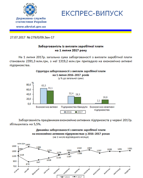 Отметим, что задолженность по выплате зарплаты в мае 2017 г. составила 2 млрд 320,2 млн грн. Таким образом, за июнь 2017 г. она увеличилась на 3,1% (или 71,1 млн грн) по сравнению с предыдущим месяцем. При этом задолженность экономически активных предприятий составляет 1 млрд 319,2 млн грн (55,2% от всей суммы задолженности).
