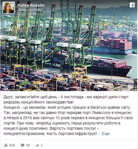 "Нигерия в 2016 году празднует десять лет передачи в концессию большинства своих портов. Причем нигерийцы оценивают первые результаты ... очень позитивно", - написала Ковалив.
