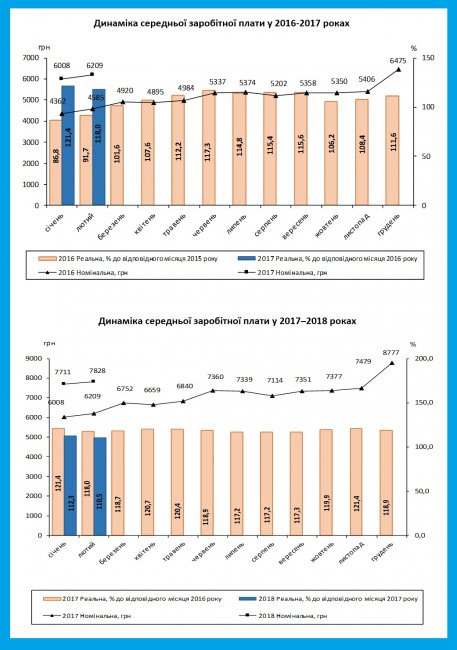 По состоянию на март средняя номинальная зарплата в Украине составляла 7828 грн. Причем этот показатель в нынешнем году тоже растет более медленными темпами, чем в прошлом. Так, в январе 2018-го падение номинальной зарплаты, по сравнению с декабрем, составило 12%, а год назад было только 7,2% (как говорилось выше, из-за декабрьских начислений за год). В феврале 2018-го номинальная зарплата выросла относительно января на 1,5%, а годом ранее – на 3,3%.