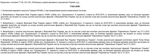 Во время рассмотрения этого дела, суд решил затребовать у координаторов коалиции (глав фракций БПП и НФ) и аппарата Верховной Рады перечень депутатов, входящих в коалицию.