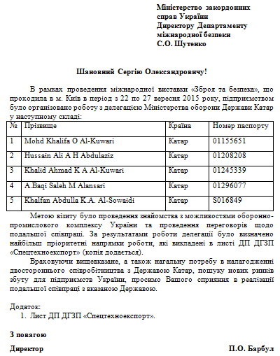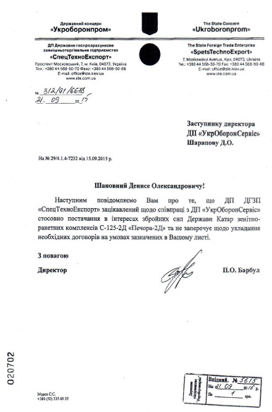 В письме есть два вложения, из которых становится понятно, что министерство обороны Катара в сентябре 2015 года активно занималось поиском вариантов закупки зенитно-ракетных комплексов.