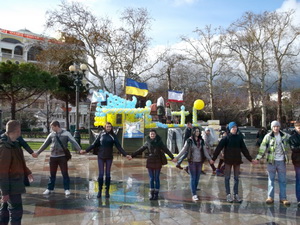 В день, когда на центральных площадях Киева шли позиционные бои между радикально настроенными боевиками от оппозиции и милицией, в "южной столице" представители "Ялтинского студенческого парламента" вместе с местной властью организовали флэшмоб "Живий ланцюг" (по-рус. живая цепь) из около сотни участников. Акция была приурочена к т.н. "дню соборности" и к 200-летию Тараса Шевченко. Специально, чтобы отснять репортаж об этом мероприятии, приехали корреспонденты центральных украинских телеканалов ("Интер", "5-ый канал" и др.), а также крымско-татарский ATR и Ялта-ТВ. Такое внимание к данному событию несколько удивило, ведь к другим, более масштабным акциям, проходившим в Ялте (против "евромайдана", против разграбления крымских земель, в честь 360-летия Переяславской Рады и др.) эти телеканалы особого интереса не проявили. По-видимому, украинствующие студенты в Крыму для киевских журналистов - это как полёт Белки и Стрелки – очень знаменательная информация.