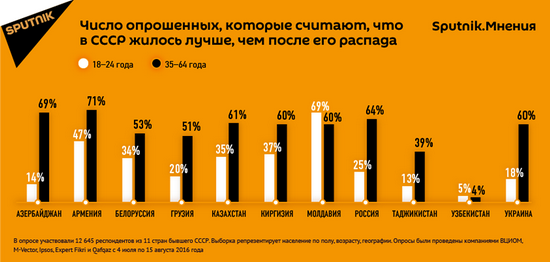 Согласно данным опроса Sputnik. Мнения, в девяти из 11 стран бывшего СССР большинство жителей старше 35 лет считают, что жизнь в Союзе была лучше, чем после развала страны.