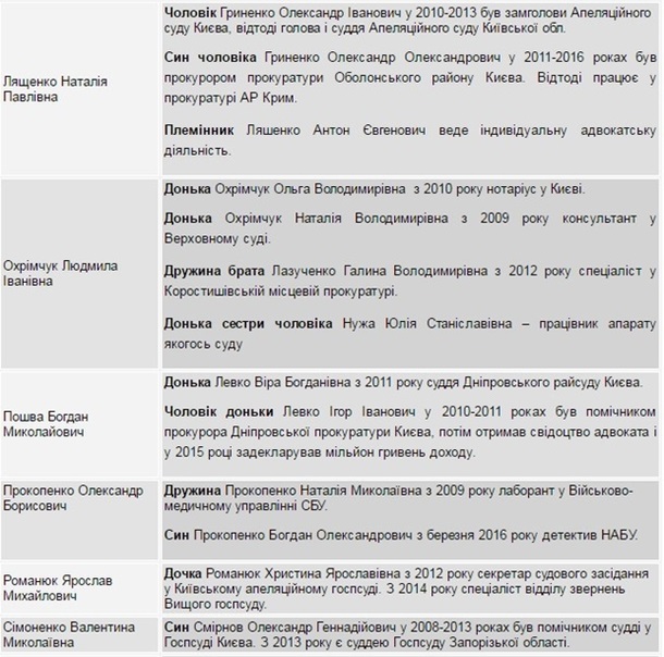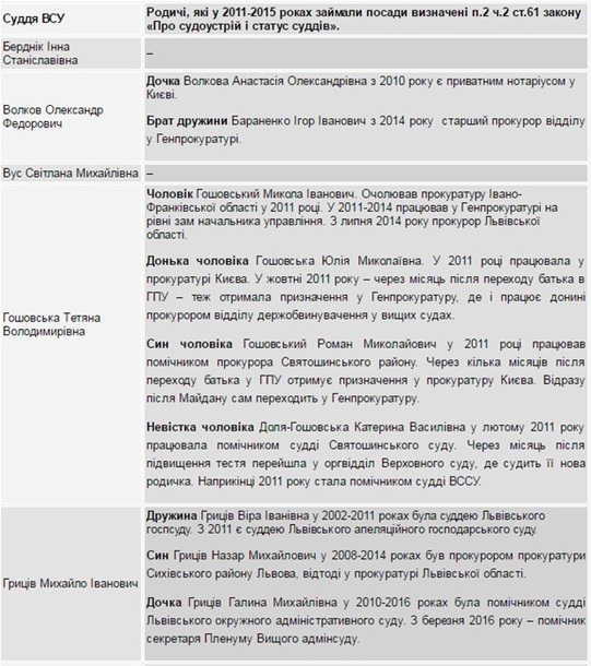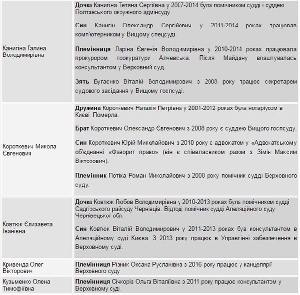 Как сообщают «Наши гроши» со ссылкой на декларации родственных связей, опубликованные на сайте Высшей квалификационной комиссии судей Украины, на административных или позициях помощников в Верховном суде работают племянницы судей Каныгиной, Кривенды и Кузьменко, племянник Короткевича, сын Ковтюк, дочь Охримчук.