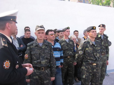 Противостояние длилось около двух часов и обострилось с появлением на графской пристани представителей командования ВМС Украины. Морские пехотинцы стали нажимать на пикетчиков. Ситуацию разрешил депутат горсовета Василий Пархоменко, который предложил заместителю командующего вице-адмиралу Маркому пройти в госадминистрацию на переговоры. При этом военные вели себя с прессой грубо и давать комментарии отказывались.