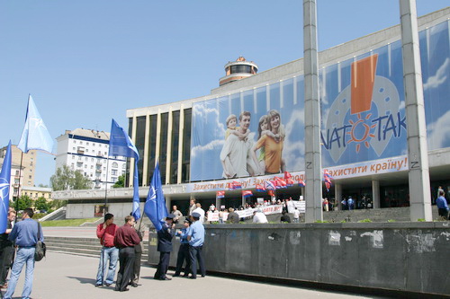 Во Дворце "Украина" так называемые "оранжевые", так называемые "демократы" проводят процесс оболванивания чиновников, студентов, тех, кого они свезли с Украины с тем, чтобы навязать им свое мнение и обязать их агитировать за вступление нашей страны в НАТО. Совершенно очевидно, что народ Украины категорически против втягивания в НАТО. Это подтверждается Декларацией о государственном суверенитете.