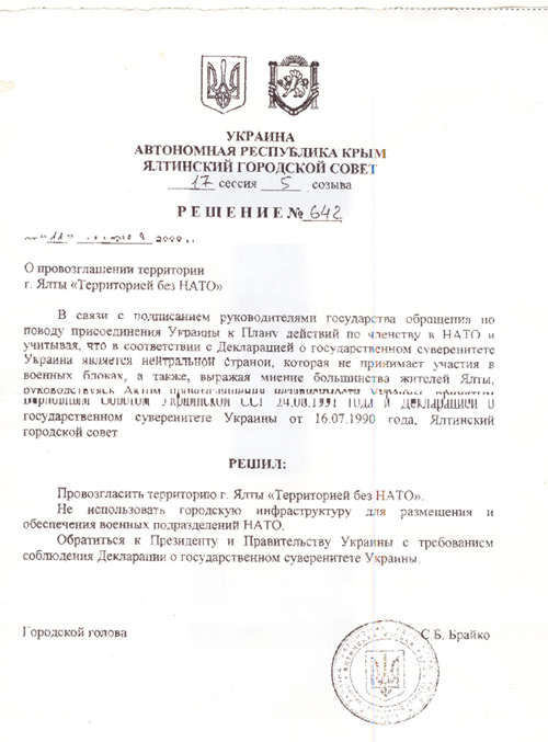 11 июня 2008 года на сессии Ялтинского городского совета было принято решение о провозглашении территории г. Ялты "территорией без НАТО". В решении говорится, что депутаты не дают согласия на использование городской инфраструктуры для размещения и обеспечения военных подразделений НАТО.
