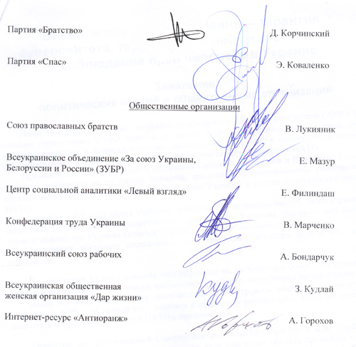 А также представители общественных организаций – Геннадий Литвинов (Союз православных братств), Владимир Марченко (председатель Конфедерации труда Украины), Александр Бондарчук (председатель Всеукраинского союза рабочих), Зинаида Кудлай (зам. председателя Всеукраинской общественной организации "Дар жизни"), Елена Мазур (председатель Всеукраинского объединения ЗУБР), Евгений Филиндаш (руководитель Центра социальной аналитики "Левый взгляд"), Александр Горохов (интернет-ресурс "Антиоранж").