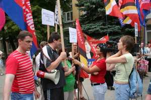 Первыми подошли сторонники ПСПУ, начавшие скандировать "Позор фашистам!", "Украине нужен мир, а не нацистский мундир!" и "Внуки партизан оккупантов не боятся!". Вскоре начали подходить активисты и других партий. Милиция оцепила националистов двойным кольцом, и последним пришлось начинать свой митинг на том месте, где они успели собраться.