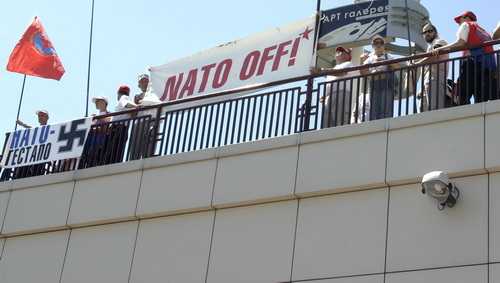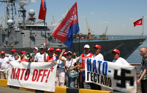 "НАТО, гоу хоум!"- скандировали пикетчики, сопровождая заход