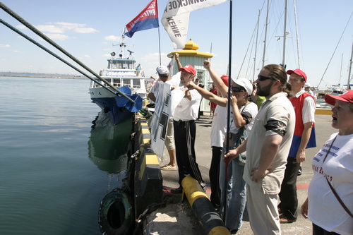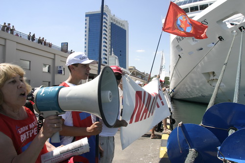 12 июля 2008г, в районе 12 часов, в акваторию морского вокзала города Одессы вошел непрошеным гостем НАТОвский фрегат турецких военно-морских сил F-495. Еще на входе в порт фрегат встретил пикет прогрессивных социалистов и представителей Евразийского союза молодежи. Активисты антиНАТОвского сопротивления на протяжении всего времени от начала захода в порт и до швартовки сопровождали турецкий фрегат скандированием антиНАТОвских лозунгов, часть из которых была написана на плакатах английским языком: "NATO – OFF!", "НАТО – хуже гестапо!", "НАТО, гоу хоум!", "Украинская страна посылает НАТО на...", "Мы не янки, мы славяне, наши братья россияне!", "Украина внеблоковая страна!", "Настоящий одессит НАТО в дом не пригласит!" . Мощное скандирование слышали не только на турецком фрегате но и по всему одесскому морвокзалу, пассажиры с нескрываемым интересом наблюдали за действиями прогрессивных социалистов многие из них присоединялись к пикету и вместе с ним выражали свое негативное отношение к незваному гостю. Если в прошлом году этот же фрегат швартовался на значительном расстоянии от гражданских судов, стоящих на морвокзале, то сейчас он пришвартовался в непосредственной близости от них, безусловно, это не могло не вызвать беспокойства и возмущение среди одесситов и пассажиров морвокзала. Видя столь не теплый прием одесситов, команда корабля, выстроившаяся на палубе для торжественного приема, вынуждена была покинуть палубу и спрятаться во внутренних помещениях фрегата, дабы не раздражать своим присутствием разгневанных жителей города и пассажиров, собравшихся на причале, и не стеснявшимися в выражении своих чувств по отношению к оккупантам.