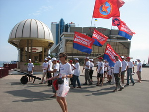 В течение часа ими была спровоцированная попытка снести лагерь руками представителей "НАТО –ТАК!", которые, как по звонку, в течение получаса появились перед антиНАТОвским лагерем. Провокаторы убрались восвояси , не выдержав напора подготовленных физически и юридически представителей Одесского областного комитета Прогрессивной социалистической партии Украины.