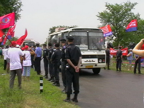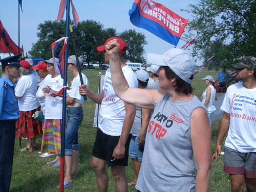 Наши ряды также усилились прибывшими на подмогу экипажами из палаточного лагеря, и общее число антиНАТОвских активистов выросло до 75 человек. Этим составом наша группа, поддержанная патриотическими песнями, выглядела, как настоящий боевой отряд, перед которым сникла и скукожилась до жалкого состояния кучка наймитов. Выезжавшие с полигона украинские журналисты не могли под громкий звук "Дня победы" брать интервью у руховцев, изображающих радость от присутствия НАТОвских вояк на Украине.
