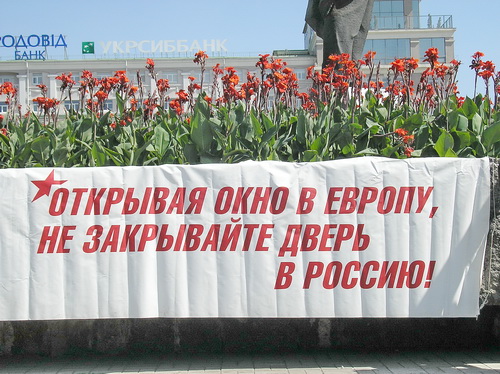 С 10 часов утра на площади стояли палатки и висели лозунги: "Ющенко - НАТО, маме - гроб из военкомата!", "Долой оранжевое свинство! Даешь славянское единство!", "Саакашвили - кум Ющенко, но не генацвале Украины!" и многие другие.