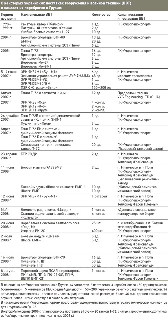 Военно-техническое сотрудничество Украины и Грузии активизировалось после 2004 года, когда к власти в Грузии пришел Михаил Саакашвили, отмечает газета со ссылкой на документ Специальной комиссии Верховной Рады, в котором имеется полный перечень техники, поставленной Тбилиси за последние 10 лет.