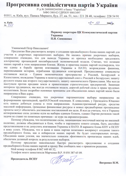 Предлагаю Вам рассмотреть вопрос о создании предвыборного блока наших партий для участия в досрочных парламентских выборах. Не касаясь причин досрочных выборов, совершенно очевидно, что для вывода Украины из кризиса необходимо предложить альтернативу прозападной неолиберальной экономической модели. Считаю, что позиции наших партий в этом направлении близки. Жизнь и практика наших партий подтвердила, что мы едины в борьбе против втягивания Украины в НАТО, возрождения фашизма, переписывания истории, ограбления трудящихся олигархией. Прогрессивные социалисты отстаивали всегда Единое экономическое пространство с Россией, Белоруссией и Казахстаном; вхождение Украины в межгосударственный союз с Россией и Беларусью; защиту русского языка как второго государственного, защиту канонического Православия. Мы всегда выступали против продажи земли и приватизации стратегических предприятий. Защищая интересы трудящихся, мы всегда отстаивали модель дорогой рабочей силы и права трудовых коллективов. Более подробно основные принципы для объединения левых партий мною были направлены в Ваш адрес.