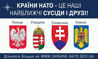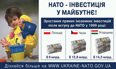 "Страны НАТО - наши ближайшие соседи и друзья! Польша, Венгрия, Словакия, Румыния"; "Украина + НАТО = безопасность. Мы в безопасности! А ты?"; "НАТО - инвестиция в будущее. Рост прямых иностранных инвестиций после вступления в НАТО в 1999 году: Польша - $8 млрд., Чехия - 12,8 млрд., Венгрия - 14,5 млрд." и "Направляешься в ЕС? Первая остановка - НАТО!" (по материалам РИА "Новый Регион").