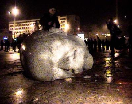 Поскольку мощности крана-десятитонника не хватало, чтобы поднять верхнюю часть памятника, из ситуации вышли просто: потянули в сторону. В результате памятник упал и разбился на три огромные части и ещё десяток поменьше. Специалисты утверждают, что восстановлению не подлежит. При этом вокруг площади находилось несколько групп нетрезвой молодёжи. Кто-то выкрикивал "Зиг хайль!", а несколько молодых людей, вскинув руки в нацистском приветствии, воодушевлённо орали "Ще не вмерла...". До утра вандалы пытались сдвинуть с места постамент памятника. Буксовали тяжёлые КАМАЗы, переворачивался мощный кран, лопали металлические тросы, а постамент с места не смогли сдвинуть ни на йоту. В 5 часов плюнули и разъехались. В общем, власть показала не просто неспособность что-либо созидать, строить, а даже неспособность ломать. Ведь даже для разрушения того, что было создано в советское время, нужен ум. Его-то нынешним "очильнычкам" хватает только на примитивные дерибан и воровство.
