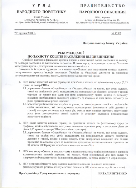 05.12.08 данные рекомендации были направлены Председателю правления НБУ В. С. Стельмаху.