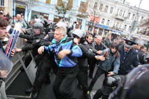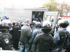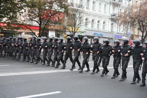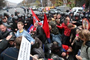 Милиция расчленила на несколько частей начавшую формироваться колонну ПСПУ. На Крещатике она была зажата между двумя вооружёнными до зубов беркутовцами и "Барсом". Попытки пройти к своим однопартийцам заканчивались избиением демонстрантов. Женщин милиция не