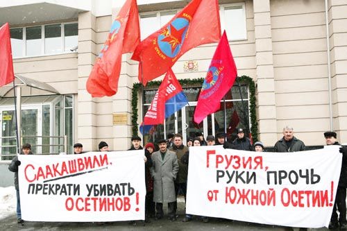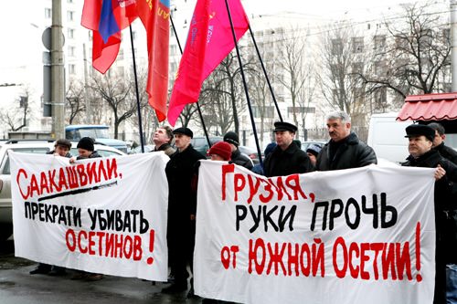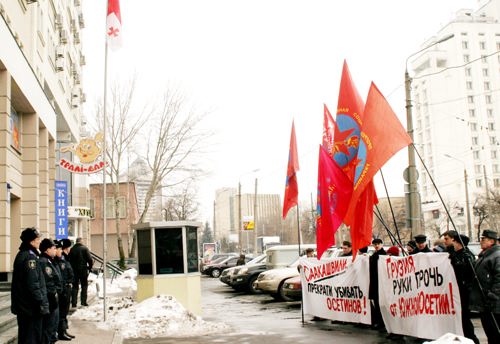 Акция проходила под лозунгами: "Грузия, руки прочь от Южной Осетии!", "Саакашвили, прекрати убивать осетин!"