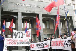 Пикетчики держали в руках плакаты "Українська наша хато, не впускай бандитів з НАТО!", "Нет ПРОнатовским планам в Украине!", "NATO OFF!", "Мы - не янки, мы - славяне, наши братья - россияне!" "НАТО - нет!", "НАТО, руки прочь от Украины!" и другие.