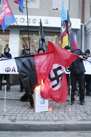 ПОД СТЕНАМИ ГЕНЕРАЛЬНОГО КОНСУЛЬСТВА ПОЛЬШИ СОЖЖЕНЫ ПОРТРЕТ КОМАНДИРА УПА, ГАУПТШТУРМФЮРЕРА СС РОМАНА ШУХЕВИЧА, ФЛАГИ НАЦИСТСКОЙ ГЕРМАНИИ И ИХ ПОСОБНИКОВ.
