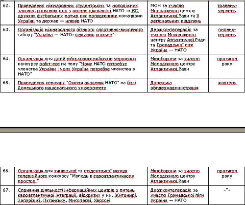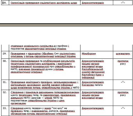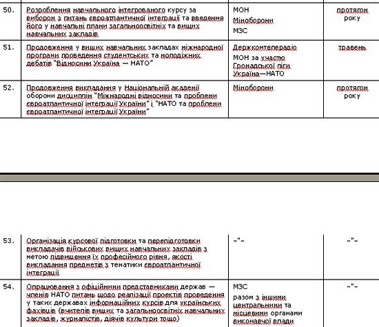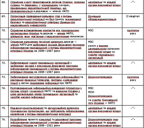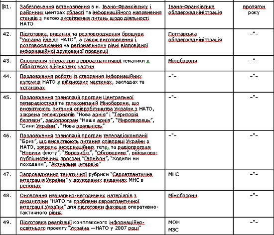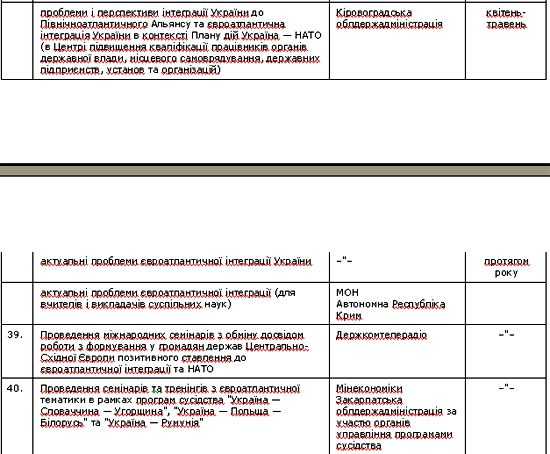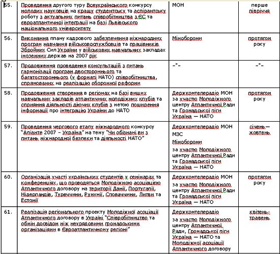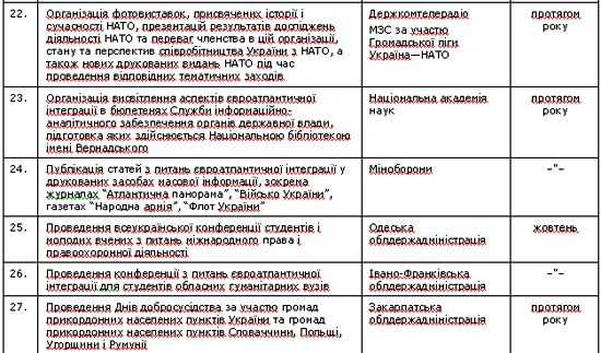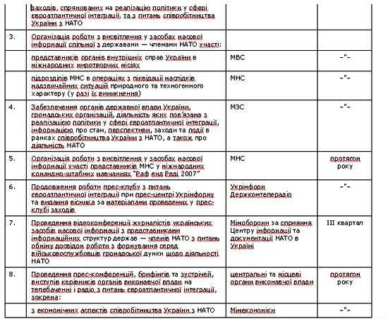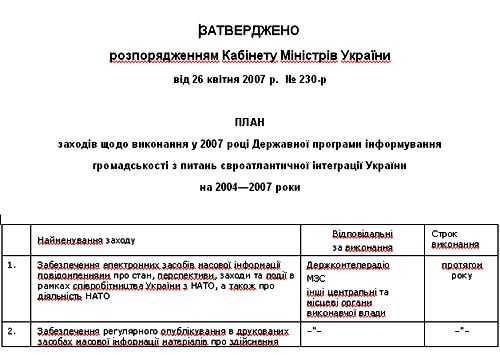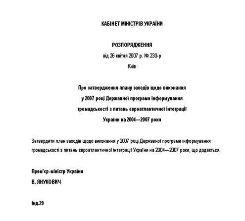 4 мая правительственный сайт "Украина-НАТО" (http://ukraine-nato.gov.ua) сообщил, что правительство Виктора Януковича своим распоряжением от 26 апреля 2007 г. N230-р утвердило План мероприятий по выполнению в 2007 году Госпрограммы информирования общественности по вопросам евроатлантической интеграции Украины на 2004-2007 годы.