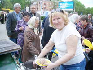 И это было не "благотворительной кашей" для бедных. Хорошо одетые люди, с детьми с удовольствием подходили к нашей полевой кухне, интуитивно ощущая, что эта простая и в тоже время праздничная еда, объединяет и уравнивает сегодня всех, кто отмечает этот замечательный день и ощущает себя наследниками великого подвига.