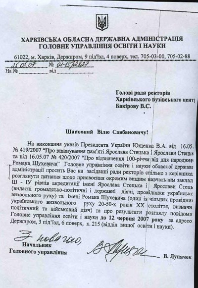 В нем пан Лунячек, начальник главного управления образования и науки Харьковской облгосадминистрации, адресуется к совету ректоров Харьковского вузовского центра с просьбой: "на виконання указiв Президента... розглянути питання щодо присвоення окремим навчальним закладам iменi Ярослава Стецька i Ярослави Стецько... та iменi Романа Шухевича".