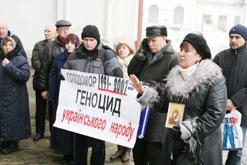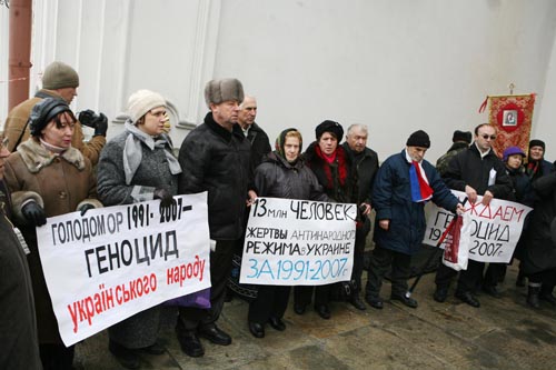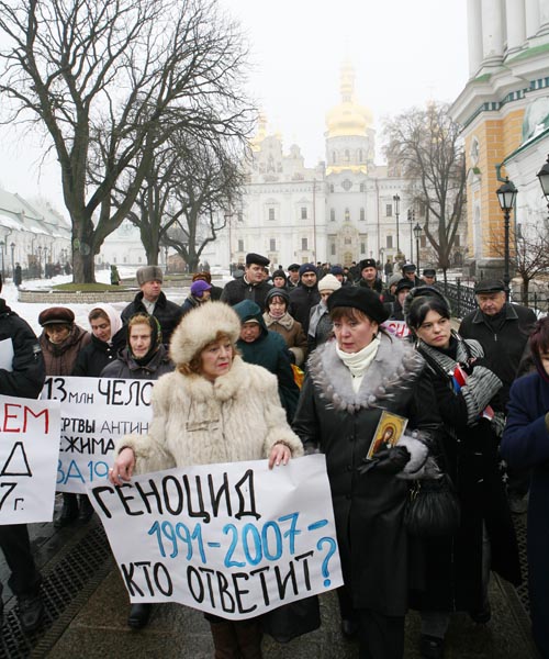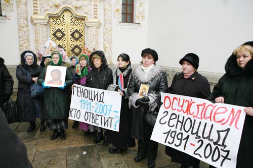 В день, когда антинародный президент инициировал очередную показательную акцию на Михайловской площади, православные верующие СПБУ и члены ПСПУ возле Свято-Успенского собора Киево-Печерской Лаврыпровели панихиду в память жертв политики геноцида украинского народа за годы независимости.Участвующие в панихиде держали в руках плакаты: "ГОЛОДОМОР 1991-2007 – ГЕНОЦИД УКРАИНСКОГО НАРОДА", "ОСУЖДАЕМ ГЕНОЦИД 1991-2007", "ГЕНОЦИД 1991-2007: КТО ОТВЕТИТ?" и др. По церковным канонам православные люди всегда должны свидетельствовать об истине, независимо от позиции власти. К сожалению, почитателю всех конфессий Ющенко этого не понять.