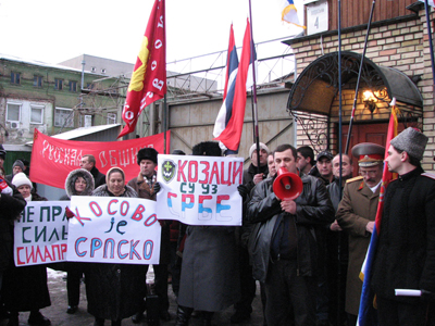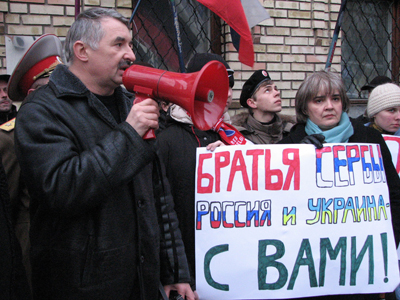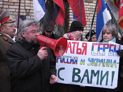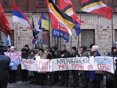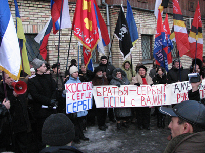 Мировое господство США сегодня там, на передовой, среди наших братьев-сербов. Прогрессивные социалисты поддерживают сербов, как мы поддерживали братьев-югославов во время агрессии 1999 года. Мы считаем незаконным провозглашение независимости Косово, это попытка передела мира, попытка изъятия исконно сербской территории и размещения там НАТОвских баз. Совершенно очевидно, что американцы, размещая системы противоракетной обороны в Европе, аннексируют Косово, и там, безусловно, будут размещать свои военные базы. Втягивая Украину в НАТО, втягивая Грузию в НАТО, американцы создаю кольцо по удушению России. Это война против России, война против православно-славянской цивилизации. Мы должны это понимать, и вместе с братьями-сербами, вместе с великой Россией мы выступаем против так называемой независимости Косово. Мы выступаем за целостность Сербии.