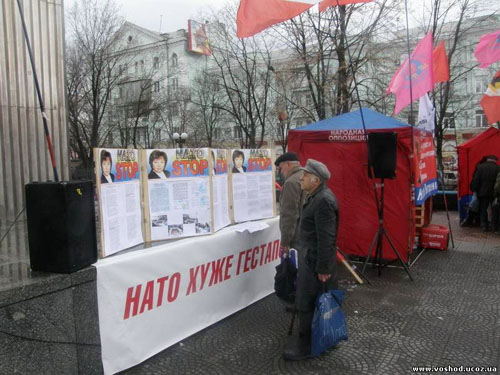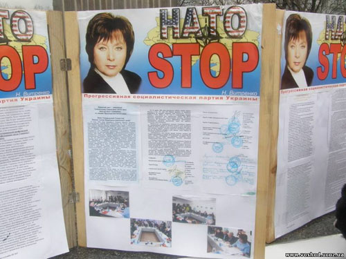 Антинатовская акция началась с 8:30 15 марта с работы агитационных пикетов Прогрессивной социалистической партии Украины. В палатках ПСПУ распространялась партийная и антиНАТОвская литература, газета "Восход", собирались подписи в поддержку инициативы депутатов Блока Наталии Витренко "Народная оппозиция" о признании территорий г. Луганска и Луганской области - территориями без НАТО. Луганчане в течение нескольких часов работы пикета слушали антиНАТОвские песни, записи выступлений Н.М.Витренко о сущности НАТО, призывы к жителям Луганска подойти на пикет, не остаться равнодушным, поставить свою подпись под резолюцией митинга и в подписном листе за "территорию без НАТО" на Луганщине. Несмотря на усиливающийся дождь к палаткам ПСПУ подошли более 2000 человек, взяли подарочные пакеты с надписью "НАТО-СТОП" в которые прогрессивные социалисты заранее положили подборку газет. брошюр на антиНАТОвскую тему. Большой популярностью на пикете пользовался информационный стенд "НАТО-СТОП", где люди смогли ознакомиться с материалами по НАТО, о признании территориями без НАТО конкретныхнаселенных пунктов Украины, об антиНАТОвском сопротивлении прогрессивных социалистов на протяжении нескольких лет.