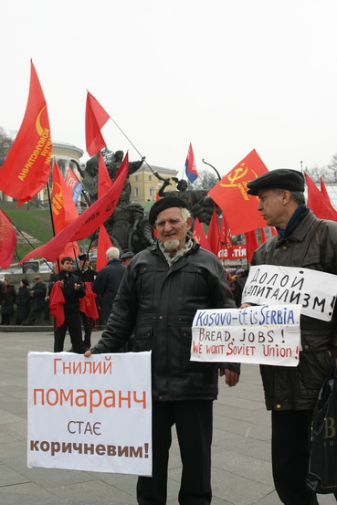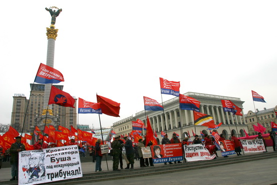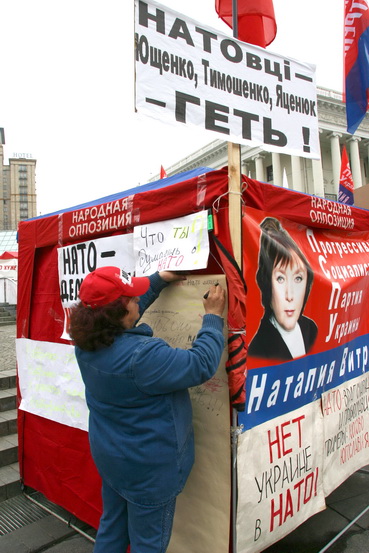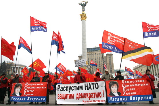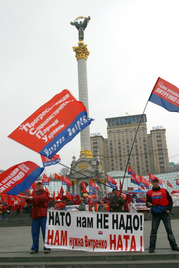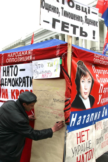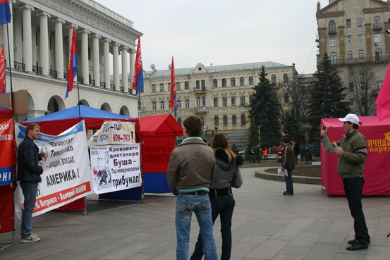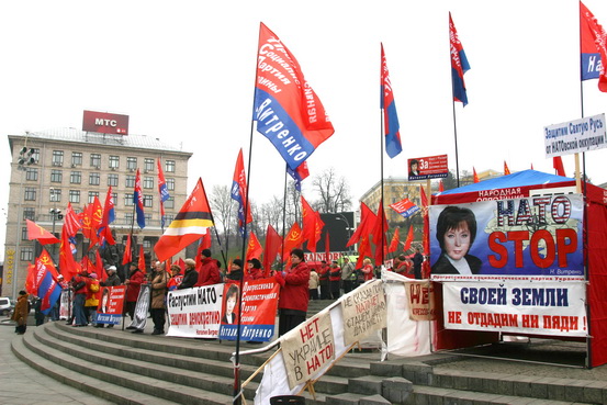Силами двух партий - Коммунистической партии Украины и Прогрессивной социалистической партии Украины - на площади Независимости продолжается антиНАТОвская акция протеста. Мы сообщаем, о том что происходит в Украине. Что сегодня произошло? Как известно, на этом месте в 2004 году состоялся оранжевый путч. С этого места выступал кандидат в президенты Ющенко, который обещал всему народу, всему миру, что в Украине будет демократия, будут соблюдаться права и свобода человека. И что режим оранжевых будет лучше режима Кучмы. Что мы увидели сегодня? Мы увидели, что, растаптывая волю народа, выбор нашего народа, быть внеблоковым нейтральным государством, оранжевая камарилья Ющенко, Тимошенко, Яценюк втайне от народа незаконно подписали обращение в штаб-квартиру НАТО с просьбой присоединить Украину к плану ПДЧ, то есть фактически вступить Украине в НАТО. Мы нашими партиями плюс партия "Киевская Русь", партия "Русский блок", общественные организации 31 марта 2008 года провели большой митинг и отнесли резолюцию протеста против нарушения наших прав, прав нашей страны, международных обязательств быть нейтральным, внеблоковым государствам. Мы эти резолюции отнесли американскому посольству.