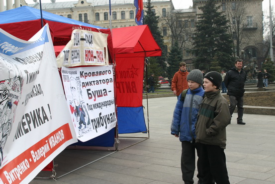 Они боятся услышать правду, они боятся услышать волю нашего народа. Бушу, как и Соединенным Штатам, нужно поработить Россию, и они хотят использовать наш народ, нашу страну в своих геополитических фашистских целях по борьбе против славянского мира. То, что делал Гитлер в 40-х годах, сегодня делает Буш. Мы с этим не согласны. И мы вышли с этой акцией протеста. В противовес нашей мирной акции протеста выставлены спецназовцы с дубинками, в сапогах, со щитами и в шлемах. Они грубейшим образом нарушали наши права. Буш и Америка принесли кровавую диктатуру в Ирак, сегодня они воюют против Афганистана, они расчленяют Косово, они разбомбили Югославию. Мы не хотим чтобы такая судьба была у нашей страны Украины, и мы не хотим кровавой диктатуры, оранжевой диктатуры, здесь, в нашей стране. Поэтому мы здесь на Майдане. Мы призываем всех киевлян, гостей столицы поддержать нашу акцию протеста присоединится к нашей акции. Мы не хотим стать резервацией, не хотим стать концлагерем, оранжевым концлагерем, где будет управлять диктатура Буша, где продадут нашу страну этому дьяволу нынешнему. Поэтому мы здесь будем проводить информационный митинг, чтобы вы знали, с какими лозунгами мы вышли сюда, что мы защищаем.