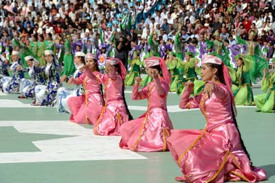 В воздухе парят разноцветные шары. После театрализованного представления, отражающего народные обычаи и национальные спортивные игры, звучат песни, прославляющие лучшие качества нашего народа. Выступают мастера искусств, звезды эстрады, молодые исполнители. Они воспевают любовь к Родине, независимость, Навруз, весну и молодость.